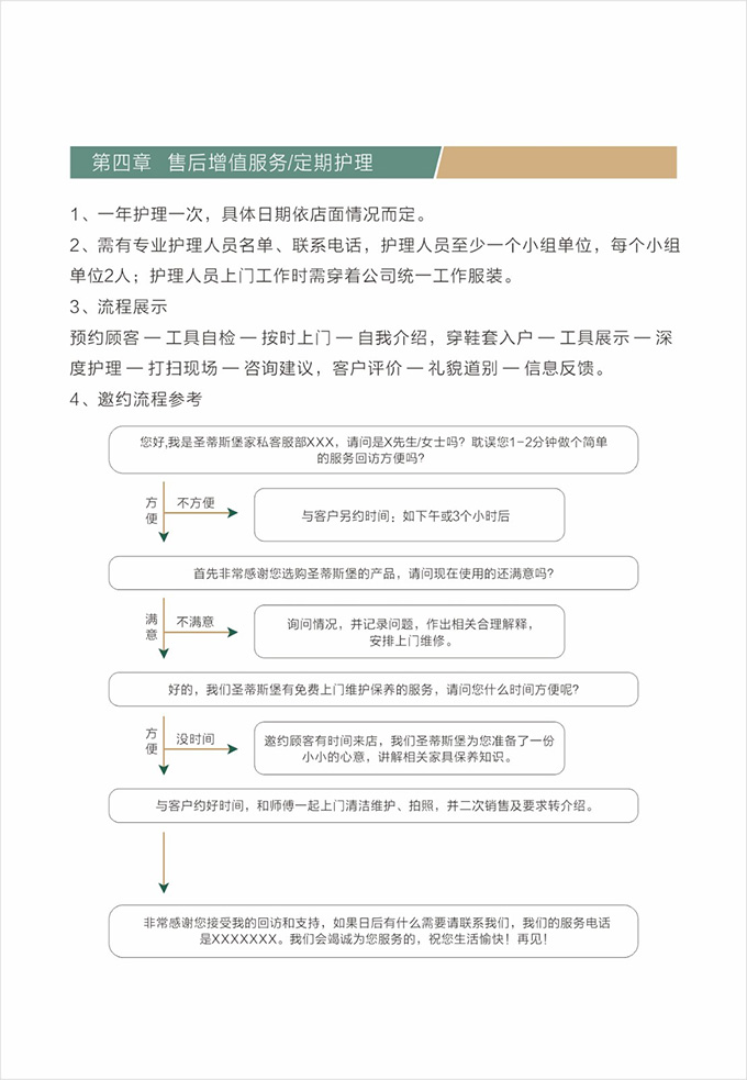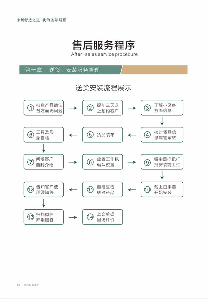 話術參考:“**先生/女士您好,我是我們的售后服務人員**,您購買的我們家具已經全部到貨了,送貨安裝大約需要**時間,請問您這邊什么時候方便我們上門送貨安裝呢?”同時要了解送貨小區的電梯、樓道、入戶門的尺寸等,提前做好準備,避免意外情況。最后確定送貨時間(安裝所需要時長),并告知客戶安裝人員的相關信息,可加微信發送,并發送配送安裝流程說明。